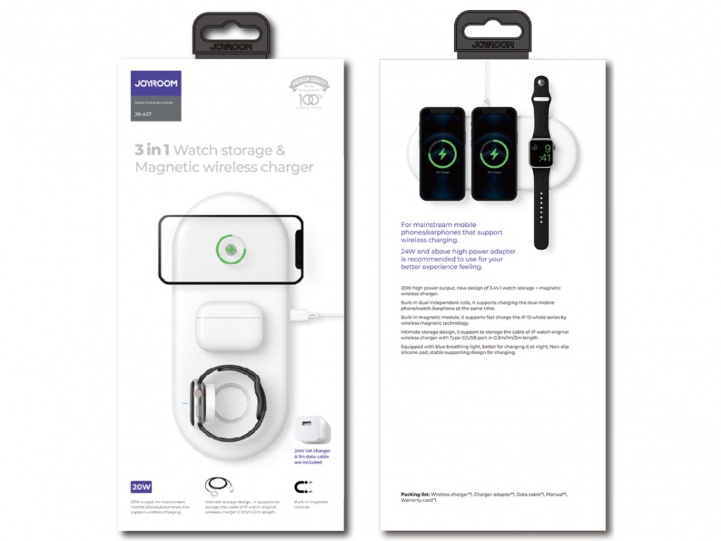 برند جویروم نمونه بسیار خوبی است که این کمپانی با تلاش و زحمت فراوان سعی کرده بهترین ها را به بازار ارائه نماید.از جمله تولیدات این شرکت شارژر وایرلس 3 در 1 جویروم Joyroom 3 in 1 wireless watch charger- EU suit JR-A27 است که با داشتن سه قابلیت یعنی شارژ موبایل ، ساعت هوشمند و هندزفری از شلوغی کیف و میز جلوگیری کرده و در کمترین زمان شارژی بهینه و صحیح را نصیبمان می کند و با توجه به تکنولوژی QI به کار رفته در این محصول با همه محصولاتی که قابلیت شارژ بی سیم دارند سازگار است.