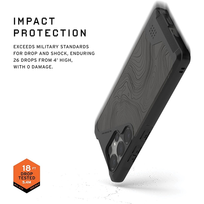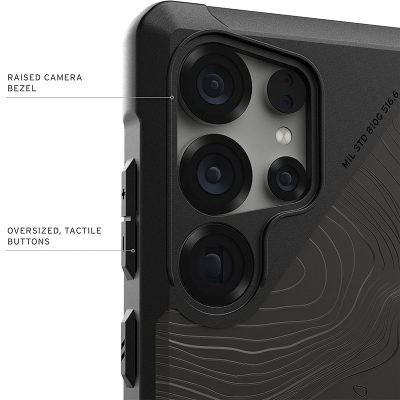 لبههای برجسته برای محافظت بیشتر: قاب UAG دارای لبههای بلند در اطراف صفحه نمایش و دوربین است که از تماس مستقیم با سطوح سخت و ایجاد خط و خش جلوگیری میکند.