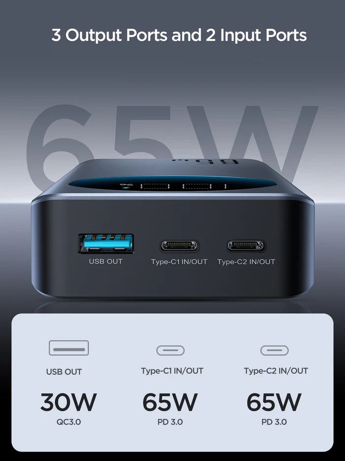 ۱. خروجی ۶۵ وات، شارژ ۶ برابر سریع‌تر برای لپ‌تاپ، تبلت و تلفن