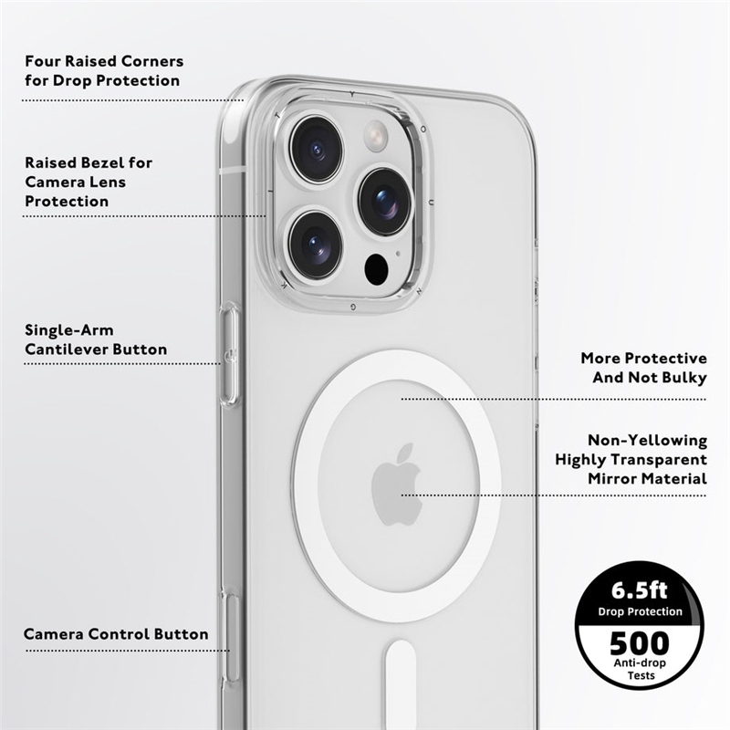 برخلاف بسیاری از قاب‌های شفاف بازار، Ice Series با استفاده از فناوری ضد زردی (Anti-Yellowing) تولید شده و در طول زمان شفافیت خود را حفظ می‌کند. بدنه شفاف قاب به گونه‌ای طراحی شده که ظاهر زیبای آیفون، به‌ویژه رنگ اصلی آن، کاملاً نمایان باقی بماند.