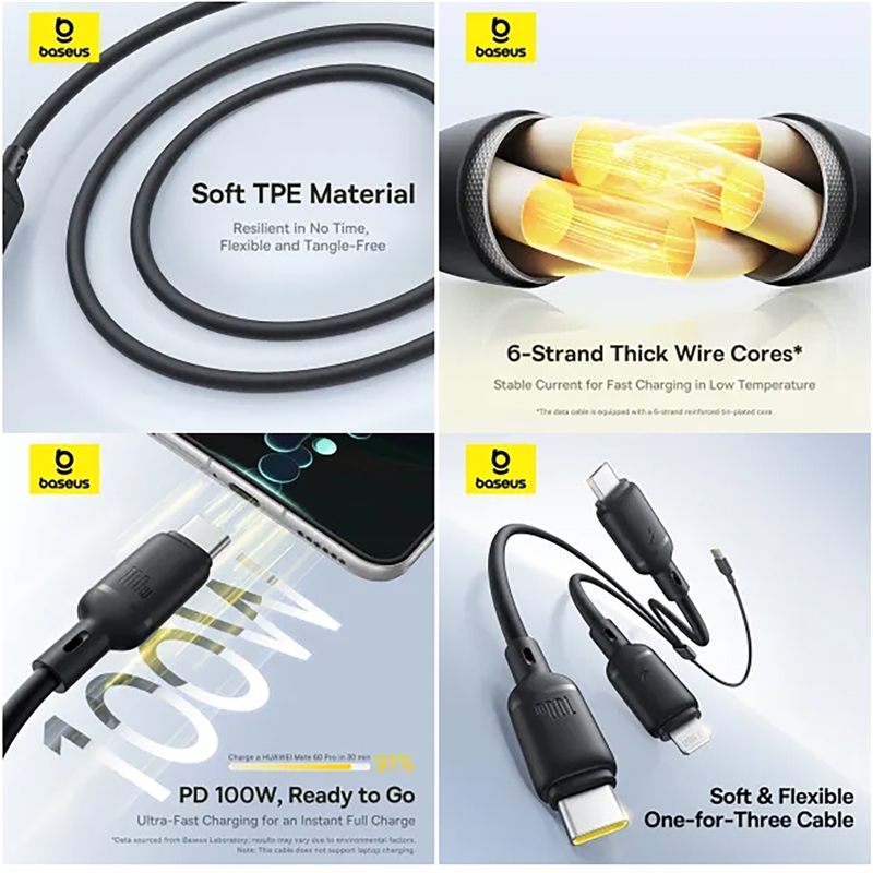 کابل سه سر Baseus Silky CB000166 با پشتیبانی از توان فوقالعاده 100 وات، طراحی حرفهای و کیفیت ساخت بالا، راهکاری کارآمد برای شارژ سریع و ایمن تمام دستگاههای شماست. این کابل ترکیبی از قدرت، زیبایی و هوشمندی است که تجربه کاربری بینقصی را فراهم میکند.