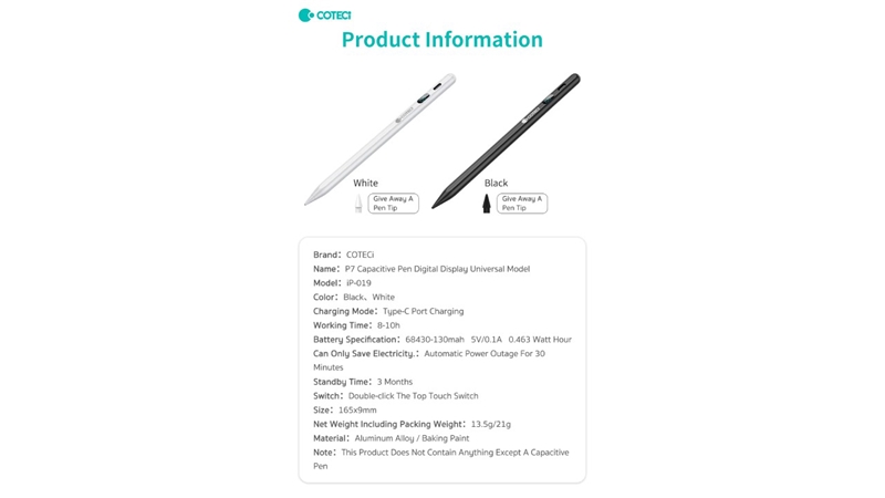 قلم لمسی کوتسی Coteci iP-019 یک ابزار دقیق و خوش‌دست برای یادداشت‌برداری، طراحی و کارهای گرافیکی بر روی تبلت و گوشی‌های هوشمند است. این قلم با حساسیت بالا به فشار و نوک نرم، تجربه نوشتن روان و بدون تأخیر را فراهم می‌کند و برای استفاده طولانی‌مدت خستگی ایجاد نمی‌کند.