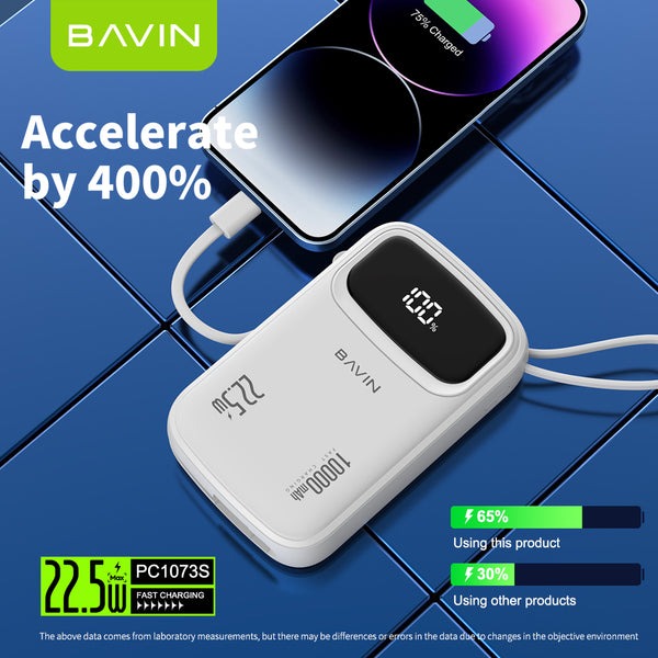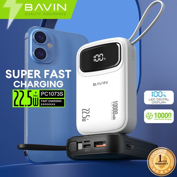 پاوربانک Bavin PC1073s یک شارژر همراه جمع‌وجور و قدرتمند است که با ظرفیت 10000 میلی‌آمپر ساعت و توان خروجی 22.5 وات طراحی شده تا دستگاه‌های شما را با سرعت بالا و ایمن شارژ کند. این پاوربانک گزینه‌ای عالی برای کسانی است که به دنبال قدرت، سبک بودن و حمل آسان هستند.