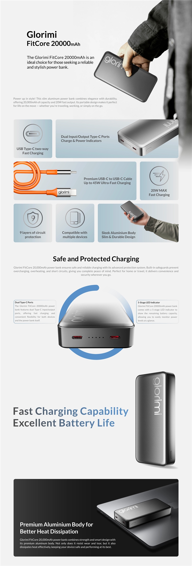پاوربانک فوق نازک 20000 شیائومی گلوریمی Xiaomi Glorimi FitCore توان 20 وات یک همراه حرفهای برای افرادی است که به دنبال ظرفیت بالا در کنار طراحی ظریف و قابل حمل هستند. این پاوربانک با ظرفیت 20000 میلیآمپر ساعت، امکان شارژ چندباره گوشیهای هوشمند، تبلت و سایر دستگاههای دیجیتال را فراهم میکند.