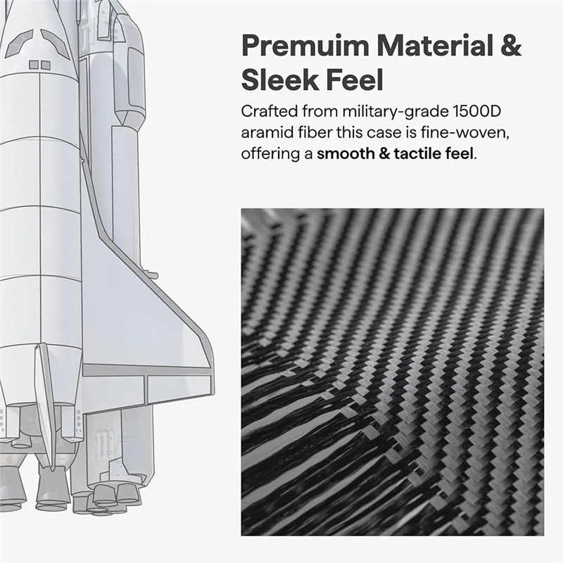 الیاف آرمید درجه هوافضا ۵ برابر قوی‌تر از فولاد و بسیار سبک است، بنابراین قاب هم سبک و هم مقاوم است. این قاب بدون ایجاد حجم اضافی از گوشی شما محافظت می‌کند و دوام بالایی دارد.