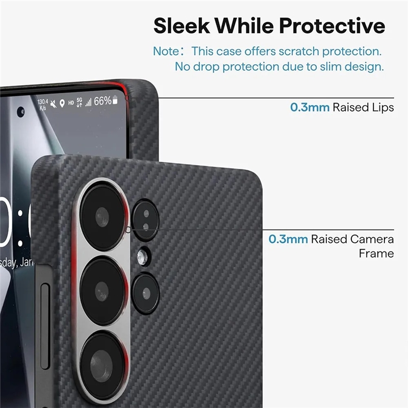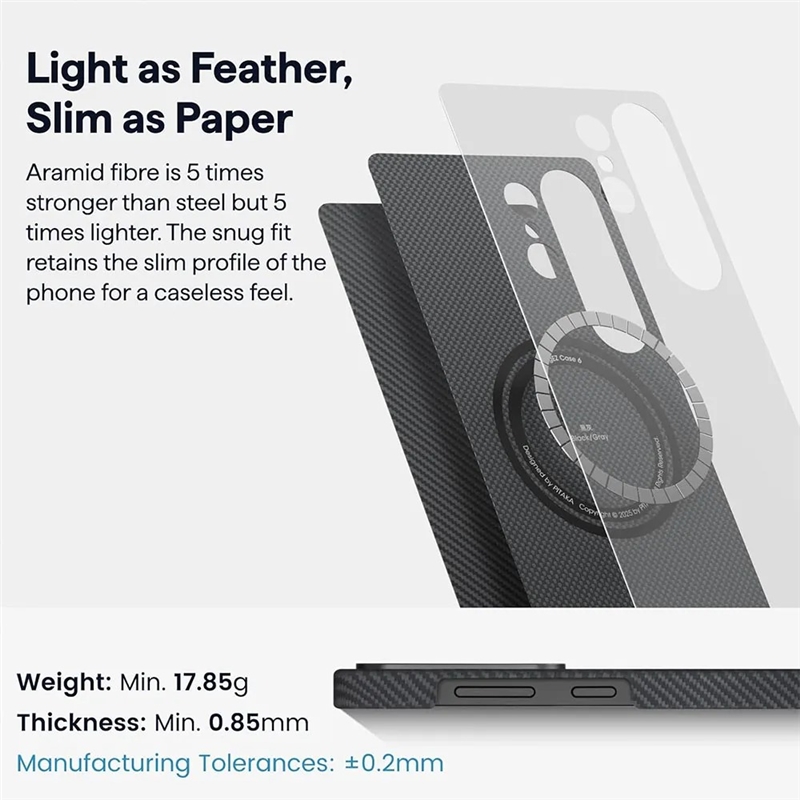 با ضخامت حدود ۰.۹۵ میلی‌متر و وزن تنها ۲۳.۸۹ گرم، قاب گلکسی S25 Ultra مدل PITAKA Ultra-Slim Case 600D یک محافظ تقریباً نامرئی است که برای طرفداران طراحی مینیمال و سبک، انتخاب ایده‌آل محسوب می‌شود. لمس بافت لطیف آرمید، حس لوکس و دلپذیری به کاربر منتقل می‌کند و تجربه نگه داشتن گوشی را لذت‌بخش می‌کند.