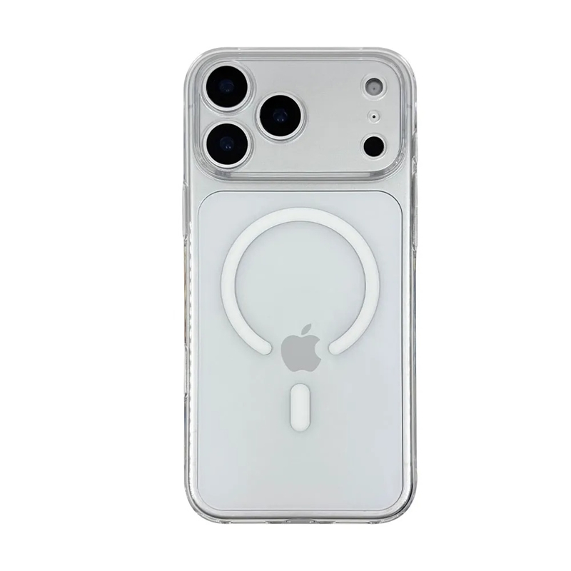 رینگ مگنتی یکپارچه و قوی (رنگ سفید): یک حلقه آهنربایی با قدرت مناسب و رنگ سفید (که با طرح شفاف قاب هماهنگی دارد) در پشت قاب تعبیه شده که سازگاری کامل با تمام accessoriesهای MagSafe را تضمین می‌کند.