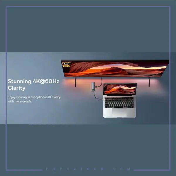پورت HDMI این هاب از رزولوشن 4K با نرخ 60Hz پشتیبانی میکند که برای اتصال به مانیتور یا تلویزیون با کیفیت بالا بسیار مناسب است. همچنین پورت Power Delivery امکان شارژ سریع لپتاپ تا 100 وات را فراهم میکند.