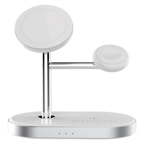 شارژر وایرلس Powerology P31MFCHWH به صورت 3 در 1 و مناسب دستگاه های اپل مثل آیفون 12 به بعد که از شارژر وایرلس پشتیبانی می کنند، ساخته شده است.