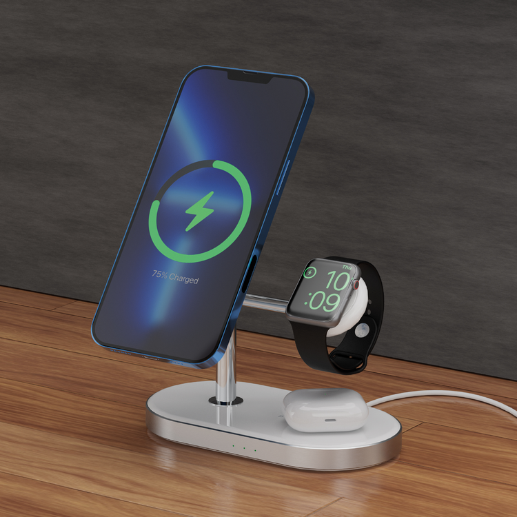 در واقع این محصول امکان شارژ همزمان اپل واچ و آیفون، آیپد، آی پاد یا سایر دستگاه های شما را فراهم می کند. همچنین با داک شارژ 3 در 1 ساخته شده برای اپل واچ، آیفون 14، آیفون 14 پلاس، آیفون 14 پرو و ​​آیفون 14 پرو مکس و تمامی سری های آیفون، شارژر MagSafe و ایرپاد است.