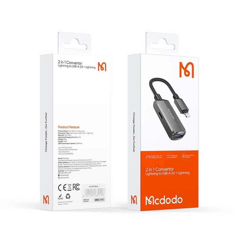 تبدیل مک دودو Mcdodo 2 in 1 Convertor Lightning to USB-A 3.0 + Lightning CA-2690 دارای کابلی با طول حدود 13 سانتی متر است. بر روی این محصول دو درگاه برای اتصال همزمان پورت شارژ لایتنینگ (آیفونی) و پورت USB3.0 وجود داشته که می‌توانید به صورت تکی یا همزمان از آن استفاده کنید. مهم ترین ویژگی این محصول امکان اتصال هارد دیسک تا حداکثر 2 ترابایت است و شما می توانید به آسانی حافظه گوشی یا آی پد خود را خالی کنید و دیگر نیازی نیست که نگران پر شدن حافظه گوشی خود باشید. تبدیل لایتنینگ به شارژر و USB مکدودو CA-2690 درگاه لایتنینگ یا همان آیفونی گوشی شما را به درگاه شارژ آیفونی و USB تبدیل می کند؛ تا شما بتوانید دستگاه خود با درگاه لایتنینگ دستگاهتان را شارژ و با درگاه USB می توانید دستگاه های از قبیل فلش مموری ، دوربین، موس و ... را متصل کنید. حداکثر شدت جریان شارژ آن 2.4 آمپر و سرعت انتقال داده ها 480Mbps است.
