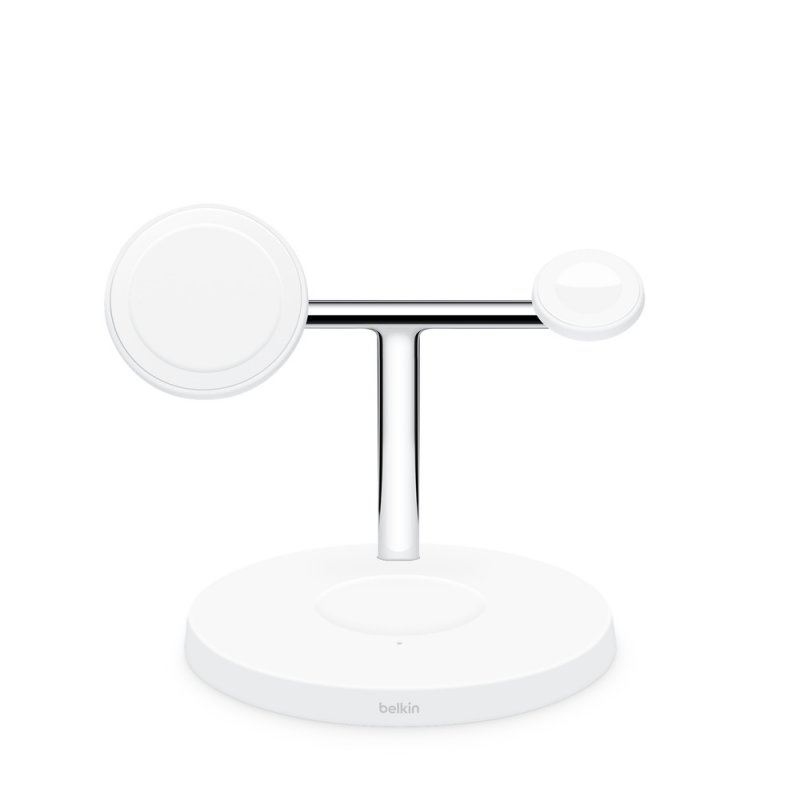استند شارژ بلکین Boost charge pro یک پد مگ سیف مخصوص آیفون 12 به بعد، محلی برای شارژر اپل واچ و یک پد شارژ وایرلس برای دستگاهی مثل ایرپاد یا گوشی دیگر دارد.