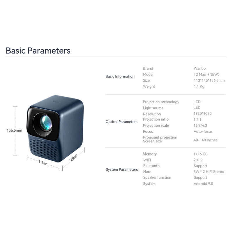 پروژکتور جدید شیائومی Wanbo T2 Max 2023 ابعادی برابر 113x146x156.5 دارد که با وجود آن که نسبت به نسل قبل چند میلیمتر بزرگ تر شده اما هنوز هم کوچک و جمع و جور است.