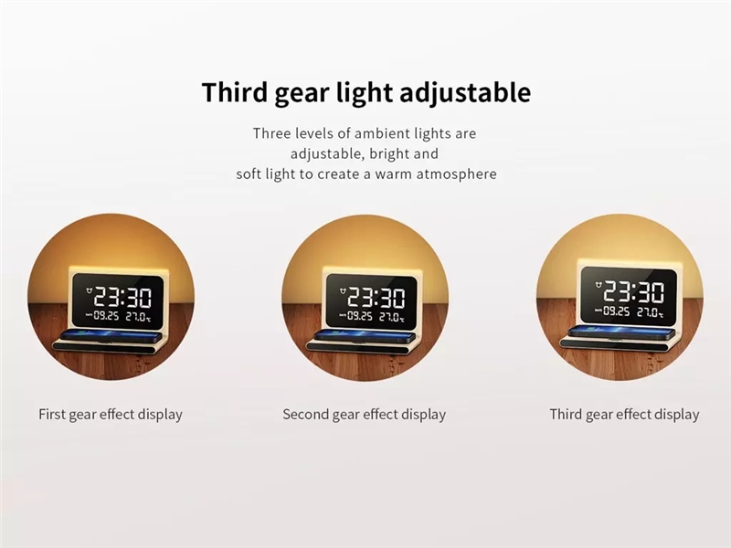 شارژر بیسیم رسی از مواد بسیار مرغوب پلاستیک ABS و اکریلیلک ساخته شده و در برابر ضربه و آسیب مقاوم است؛ طراحی فوقالعادهای دارد و جلوه زیبایی به میز میدهد. رنگ سفید آن با هر رنگی در اتاق یا لوازم روی میز ست بوده و نمایشگری بزرگ برای نمایش ساعت دارد. علاوه بر نمایش ساعت، تاریخ را هم نمایش داده و به صورت هوشمند بر دمای اتاق نظارت داشته و اندازهگیری میکند. در ضمن برای تکمیل کارایی آن از نوری زیبا برخوردار بوده که قابل استفاده به عنوان چراغخواب است و سه سطح از نور را در اختیارمان قرار میدهد.