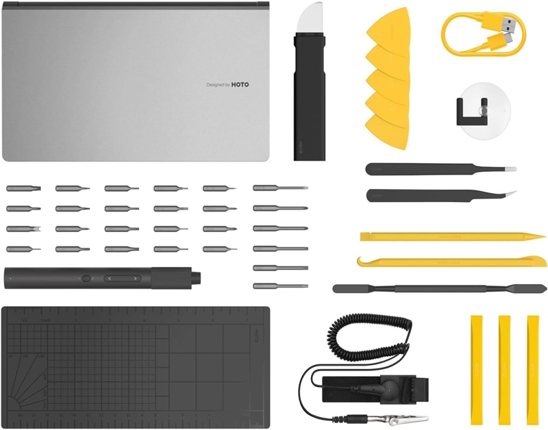 پیچ گوشتی شارژی شیائومی Hoto QWLSD012 دارای پک کاملی است و درون آن 26 سری پیچ گوشتی، پد مغناطیسی، دستبند ضد الکتریسیته ساکن، اهرم ها و ابزارهای مختلف (که بالاتر به آن اشاره شد) و کابل تایپ سی موجود است.