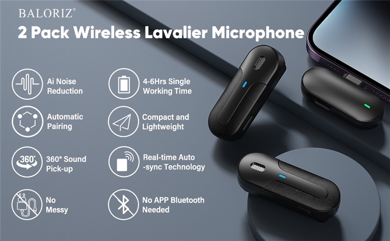 میکروفون لاوالیر بیسیم Omni-Directional: دو میکروفون لاوالیر بیسیم Omni-Directional با یک چیپ کاهش نویز DSP داخلی. این میکروفون‌ها از تمام زوایا صدا را جذب می‌کنند و ماژول کاهش نویز هوش مصنوعی دارای توانایی مقابله با تداخل قوی است که می‌تواند صدای اصلی را تشخیص داده و صدای انسان را واضح‌تر کند.