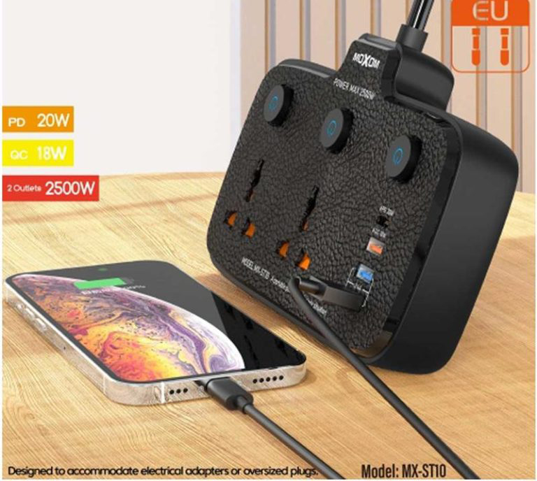 یک محصول بسیار کارامد از برند موکسوم با نام MX-ST10. این وسیله یک چند راهی برق، مبدل برق و همچنین یک شارژر همراه است که با توجه به سایز کوچکی که دارد قابل حمل و قابل استفاده هم در خانه و هم در سفر و مسافرت است. بار ها و بار ها به این مشکل برخوردیم که در خانه یا محل اقامتمان با مشکل پریز برق رو به رو شده ایم . چرا که لوازم الکتریکی متعددی را مانند گوشی تلفن همراه، لپ تاپ، سشوار و .. کنار خود حمل میکنیم. تازه برخی از این وسایل ما هستند که نیاز به یک تبدیل 3 به 2 دارند و اگر مبدل آن را ها فراموش کنیم دیگر قابل استفاده نخواهد بود. چند راهی برق و شارژر همراه موکسوم مدل SM-ST10 همه این مشکلات را یکجا برای شما برطرف میکند. کافیست تنها یک پریز برق در محل مورد نظرتان داشته باشید و SM-ST10 را به آن متصل کنید. این وسیله به راحتی هرچه تمام تر از آن آویز میشود و شما میتوانید تا 2 عدد آداپتور خود حال چه 2 شاخه یا چه 3 شاخه به آن متصل کنید و ورودی برق ایمنی داشته باشید . 2 ویژگی بسیار مهم که موکسوم آن هارا رعایت کرده، جدای از طراحی زیبا، محافظ کودک و دکمه قطعی و وصلی برق است . میتوانید در صورت نیاز با فشردن دکمه های قرار گرفته در بالای هر پریز ورودی برق به دستگاه های خود را کنترل کنید. جهت جلوگیری از آسیب دیگر نیاز به خروج کردن آداپتور خود از پریز ها ندارید و میتوانید تنها با فشردن یک دکمه این مهم را داشته باشید. جنس بدنه چند راهی برق و شارژر همراه موکسوم مدل SM-ST10 از پلاستیک ABS و PC است و روی آن طرحی زیبا قرار دارد تا بتوانید در محیط خانه نیز ضمن حفظ زیبایی منزل از کارایی آن بهرمند شوید. دیگر ویژگی مهم موکسوم SM-ST10 پورت های USB و Type-C آن است . از این وسیله میتوایند به عنوان یک شارژر دیواری نیز در هر جا استفاده کنید. در قسمت بالا دکمه پاور ، کمی پایین تر از آن در گاه USB -Type-C مشاهده میکنید که مجهز به شارژر ایمن PD و با توان 20W است و میتوانید به صورت Fast Charge شارژ سریع گوشی همراهتان را شارژ کنید، پایین تر از آن نیز یک USB مجهز به QC کوئیک شارژ با توان خروجی 18W است . پایین تر از ان نیز دو درگاه USB دیگر با جریان 2.4A وجود دارند که جهت شارژ گوشی همراه و یا دستگاه هایی مانند هندزفری های بلوتوثی، ساعت هوشمند و .. که شدت کمتری نیاز دارند استفاده کنید.