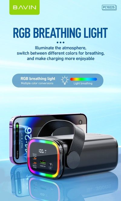 شرکت باوین برای زیبای بیشتر پاوربانک فست شارژ Bavin PC1022S نورپردازی RGB در نظر گرفته است. این نورپردازی در قسمت بالای و دور تا دور این قسمنت قرار دارد.