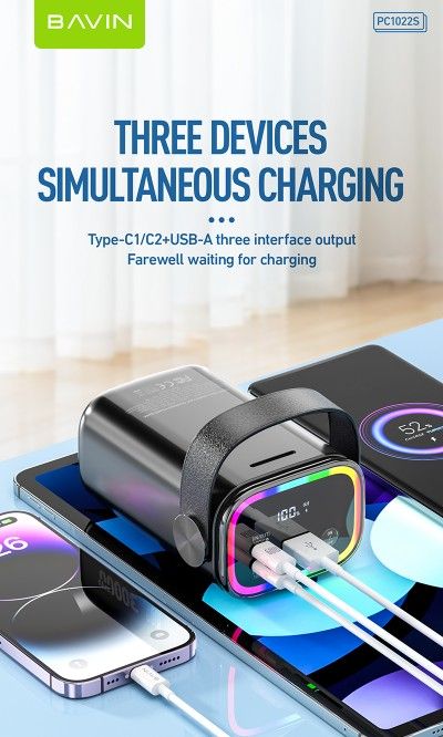 پاوربانک باوین PC1022S دارای 3 پورت خروجی کلی بوده که از این پورت ها، 1 پورت USB بوده و 2 پورت تایپ سی است. بعلاه پاوربانک PC1022S باوین دارای 2 درگاه ورودی (هر دو درگاه تایپ سی) است که می توانید به راحتی این دستگاه را به شارژ متصل کنید. قابل ذکر است درگاههای تایپ سی پاوربانک Bavin PC1022S به صورت ورودی/خروجی عمل می کند.