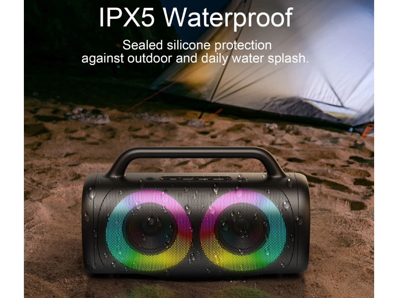 این اسپیکر از استاندارد IPX5 پشتیبانی می کند که آن را در برابر پاشش آب مقاوم می کند.