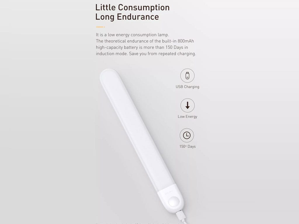 چراغ خواب DGYG000002 بیسوس بسیار کم مصرف است. دارای باتری با ظرفیت 1200 میلیآمپرساعت است؛ ورودی 5V/1A را داراست و در مدت کوتاه 2.5 ساعت به صورت کامل شارژ میشود. پس از شارژ کامل هم برای 365 روز جوابگوی شارژ خواهد بود. این میزان روشنایی با توجه به 5 بار روشنایی در شبانهروز است. فرایند شارژ با کمک کابل شارژ تایپسی که در بستهبندی آن قرار گرفته انجام میشود.