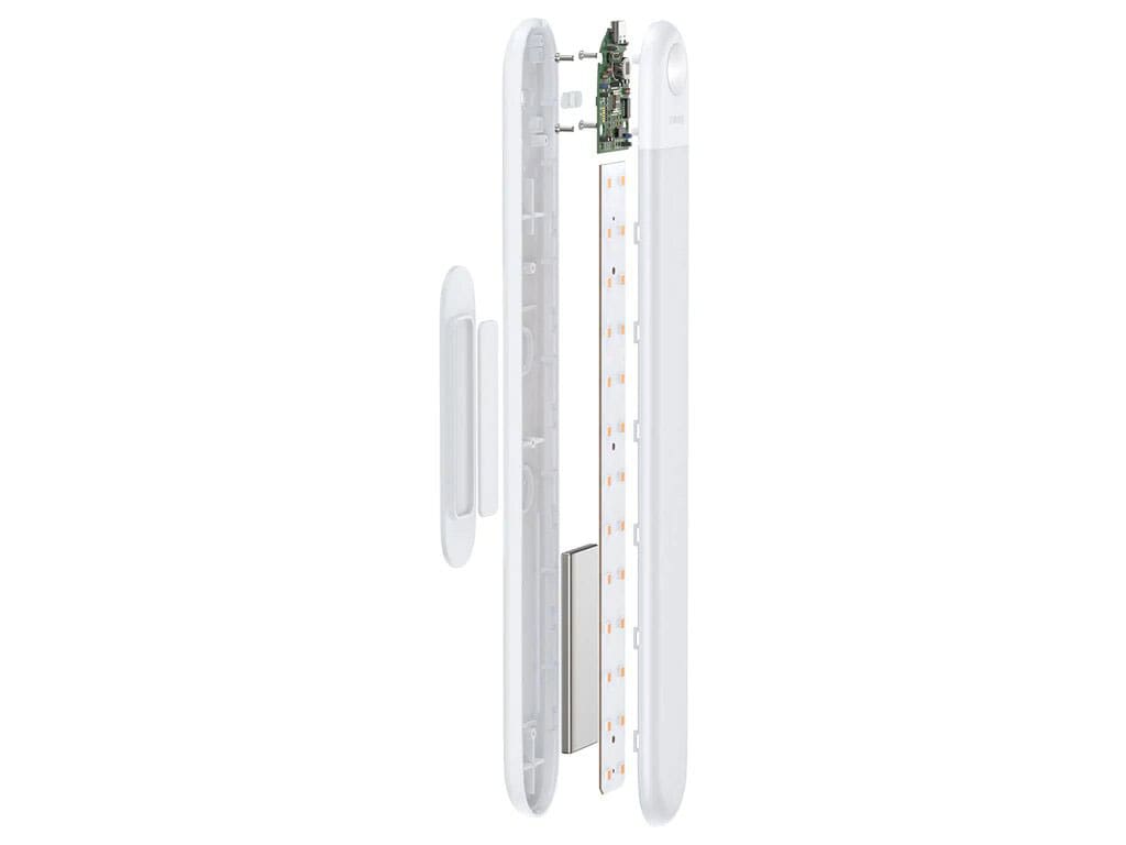 بدنهای از مواد پلیکربنات نسوز و پلاستیک مقاوم ABS دارد و در برابر آسیب و حرارت بسیار مقاوم است. ابعدی بسیار مینیمال برای آن درنطر گرفته شده که شامل اعداد 276*38.5*20.2 میلیمتر است. وزن 99.5 گرم آن هم مینیمال بودن آن را اثبات کرده و به دلیل سبک بودن به راحتی قابل جابجا کردن است. پایه آن با استفاده از چسب بسیار قوی 3M روی هر سطحی میچسبد و با قدرت مغناطیسی لامپ را جذب میکند.