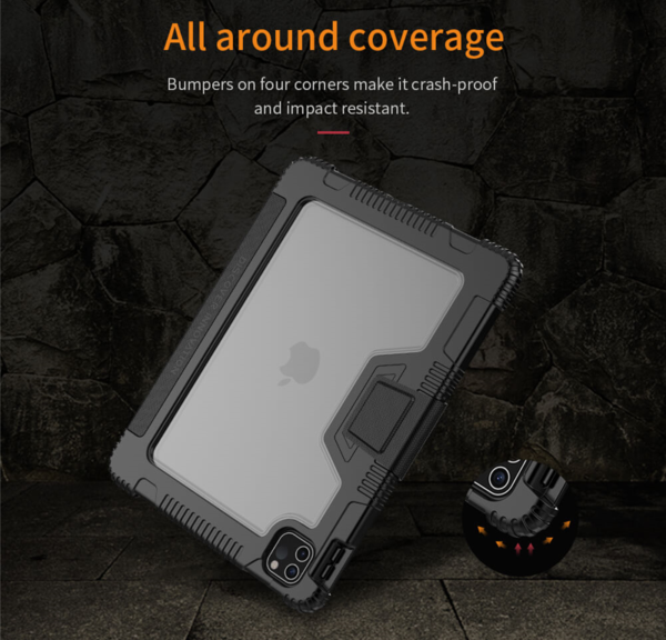 کیف های زیادی در بازار با جنس های مختلفی برای انواع تبلت های هوشمند وجود دارد که به خوبی از تبلت محافظت میکنند. امروز میخواهیم کیف آسانسوری بسیار عالی را به شما معرفی کنیم که یک کیف بسیار زیبا با طراحی شیک می باشد.شرکت نیلکین یکی از بزرگترین شرکت های تولید کننده لوازم جانبی موبایل است که جدیدترین محصول خود را برای تبلت Apple iPad Pro 11 2020 روانه بازار کرده است.این محصول که Bumper iPad Leather Cover نام دارد از مواد TPU و چرم PU ساخته شده است و از آیپد Apple iPad Pro 11 2020 در برابر هر گونه ضربه و خط و خش محافظت می کند.این کاور روکشی از مواد PU با بافت نقطه ای طراحی شده که این بافت نقطه ای باعث می شود که آیپد از دست شما لیز نخورد و دچار آسیبی نشود.همچنین در گوشه های این محصول ضربه گیر های تعبیه شده است.همچنین تمامی شیار پورتهای اسپیکر، دوربین و شارژ آن به خوبی برش خورده است و محدودیتی هنگام استفاده از آنها نخواهید داشت.