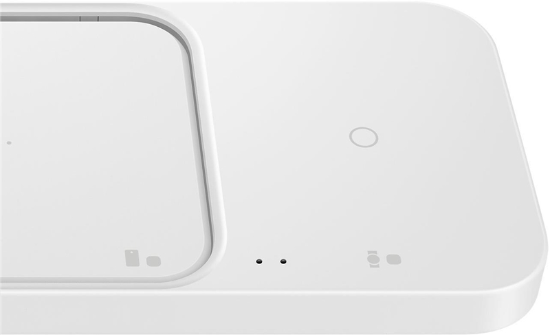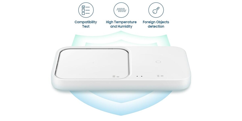 همونطور که در بالاتر گفتیم شارژر وایرلس سامسونگ Duo EP-P5400 دارای 2 پد جداگانه شارژ است که می تواند بصورت همزمان موبایل، ساعت هوشمند یا هندزفری شما را شارژ کند. پد سمت چپ مناسب موبایل و هندزفری با پشتیبانی از قابلیت PD و شارژ سریع 15 واتی است. همچنین پد سمت راست مناسب برای ساعت های هوشمند و هندزفری بوده و با این پد می توانید ساعت یا هندزفری خود را شارژ کنید. برای شارژ درست ساعت های هوشمند شما، قسمتی که روی شارژر تعبیه شده، به آهنربای داخلی مجهز شده است.البته این قسمت فقط برای Galaxy Watch سامسونگ طراحی شده است و مناسب Galaxy Active2 and Active و Galaxy Watch4 and Watch3 می باشد. بعلاوه شما می توانید هندزفری های گلگسی بادز را نیز از طریق این پد شارژ کنید.