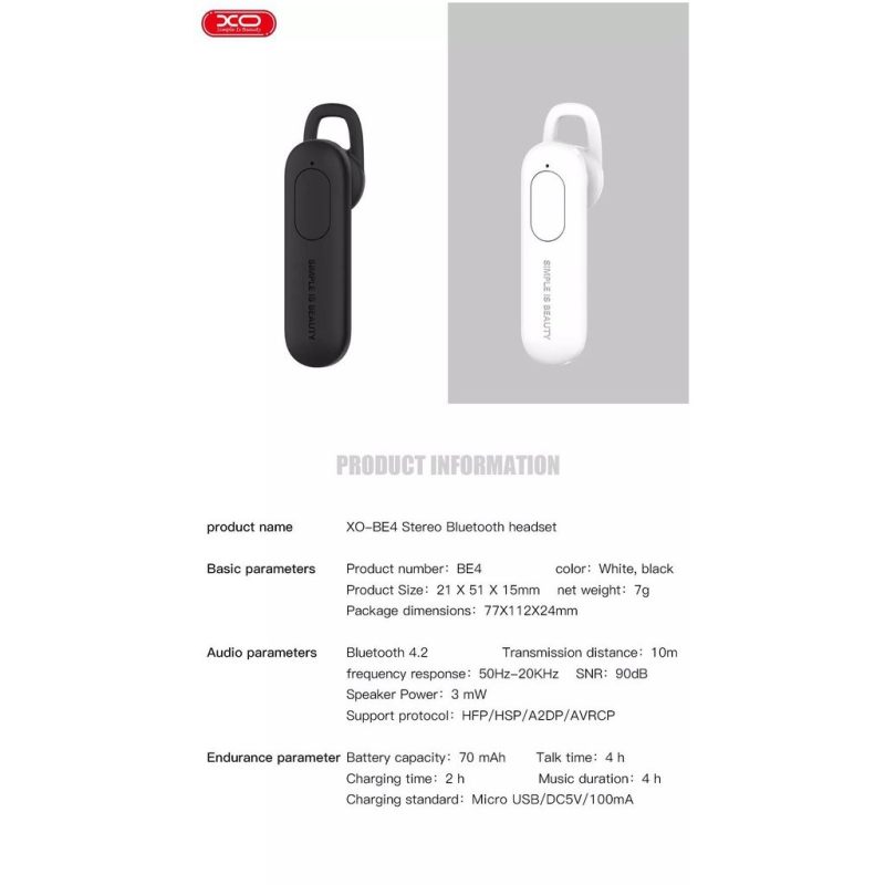 هندزفری ها جدا از استفاده بعنوان ابزاری برای گوش دادن به موسیقی، ابزاری برای مکالمه نیز هستند. حتی اگر جزو افرادی نباشید که روزانه ساعت ها به مکالمه به تلفن همراه خود می پردازید، برای محافظت از گوشی خود در خیابان و اینکه نخواهید همواره گوشی در دستتان باشد، بهترین کار استفاده از یک هندزفری است. شرکت XO یک هندزفری جدید تولید کرده که بسیار کارامد نیز می باشد. این هندزفری XO BE4 Bluetooth Wireless نام دارد که دارای یک گوشی می باشد.