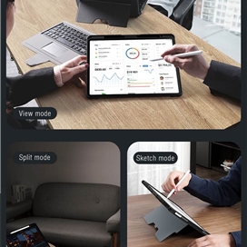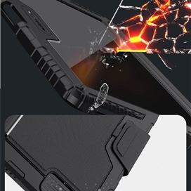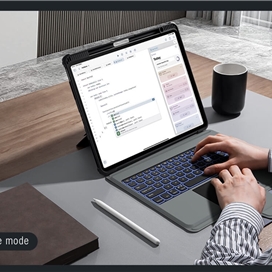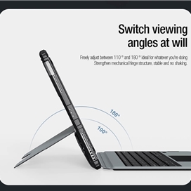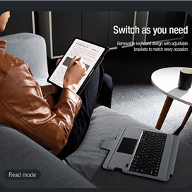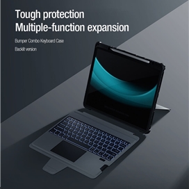 کیف کلاسوری نیلکین مدل Bumper Combo Backlit Keyboard جدیدترین نسخه Combo Keyboard می باشد که در مدل Backlit علاوه بر ویژگی های نسخه قبلی ویژگی نور پس زمینه در کیبورد با 7 رنگ متفاوت به آن اضافه شده که دیگر در فضای کم نور و یا شب به راحتی میتوانید از کیبورد استفاده کنید و دیگر دغدغه نور هنگام تایپ کردن را نداشته باشید.جنس این کاور ازTPUوPCساخته شده که دارای مقاومت بالایی می باشد.این کیف کلاسوری دارای محافظ دوربین بوده که به صورت کشویی عمل میکند.یکی از قابلیت های مفید در قاب تبلت ها داشتن استند است؛چون این دستگاه ها ابعاد بزرگی دارند و نگهداری از آن‌ها روی استند بسیار راحت تر و کم خطر تر است.از همین رو کیف کلاسوری دارای یک استند تاشو است که استحکام کافی برای نگهداشتن و استفاده از تبلت را خواهد داشت.شما می توانید حالت های مختلفی برای قرار گرفتن تبلت انتخاب کنید.این استند قابلیت تنظیم زاویه بین 110تا180درجه را دارد.این محصول نیلکین دارای یک کیبورد قابل جدا شدن می باش .شما در صورت نیاز می توانید از این کیبورد استفاده کرده و یا آن را جدا کنید.کلیدهای این کیبورد به گونه‌ای(قطره‌ای)طراحی شده که قالب انگشتان شما باشد.این کلیدها بسیار بی صدا بوده و وزن پایینی دارد؛بعلاوه کار با آن شما را خسته نمی‌کند.کلیدهای کیبورد کیف کلاسوری بسیار حساس بوده و با کمترین فشار عمل خواهد کرد.بر روی این کیبورد یک پد لمسی وجود دارد که می توانید از آن به جای موس استفاده کنید.شما می توانید از طریق بلوتوث این کیبورد را به دستگاه خود متصل کنید.نرخ نمونه برداری لمسی پد لمسی آن120هرتز بوده که بسیار حساس بوده و از چند لمس همزمان پشتیبانی می کند.این کیبورد دارای یک باتری5000میلی آمپر ساعتی بوده که برای پر شدن آن نیاز به حدود 3 ساعت شارژ بوده و با پر بودن شارژ تا100 ساعت می توانید از آن استفاده کنید؛البته این عدد برای روزی2ساعت کار با کیبورد است که متناسب با استفاده شما متغییر خواهد شد.قابل ذکر است نسخه بلوتوث این کیبورد3.0می باشد و محدوده عملکرد آن حدود10متر است.در قسمت جلویی این قاب، جای برای قرار گرفتن قلم هوشمند اپل تعبیه شده که می توانید قلم خود را در این قسمت ها قرار دهید. با قرار گرفتن قلم در قسمت جلویی تعبیه شده در تبلت، می توانید قلم خود را به صورت وایرلس شارژ کنید.