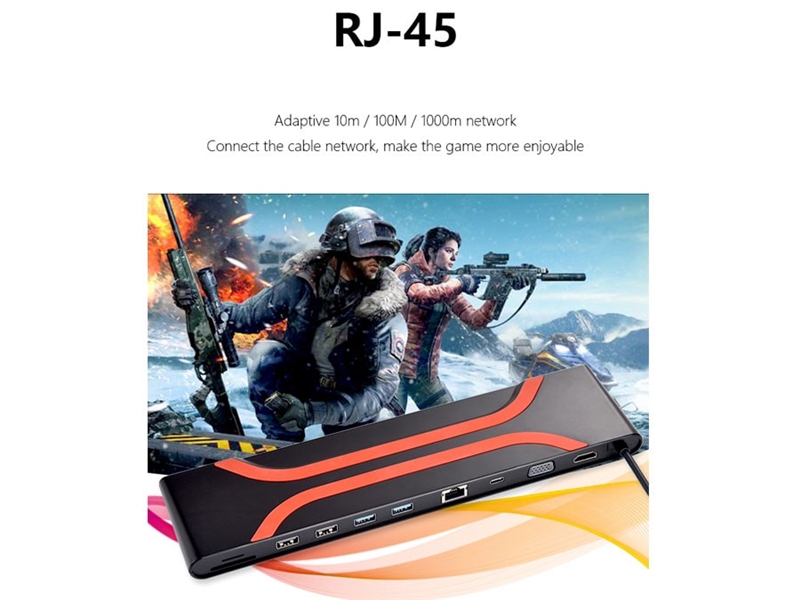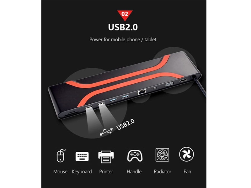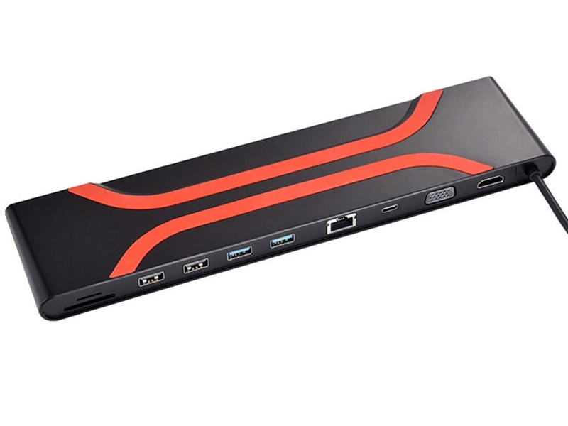 روی بدنه مبدل لنوو Lenovo LX1901 تعداد 10 درگاه وجود داردکه 4عدد USB، یک عدد RJ45، یک عدد HDMI، یک عدد VGA و یک عدد تایپ سی میباشد. در نهایت به جز این 8 پورت 2 اسلات هم وجود دارد که محل ورود کارت حافظه SD/TF هستند. هر کدام از این درگاهها دارای چیپ مستقل بوده و کارایی بهتری دارند.