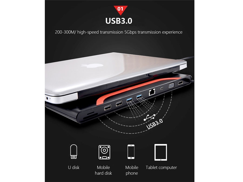 از 4 عدد درگاه یو اس بی نیز روی هاب قرار داده شده 2عدد از نوع USB3.0 و 2 عدد از نوع USB 2.0 میباشند. می توانید به طور همزمان از USB 3.0 استفاده کنید و با سرعت 5Gbps داده هایتان را انتقال دهید. از درگاه USB 2.0 می توانید به عنوان منبع تغذیه برای گوشی ، تبلت، فن خنک کننده و دیگر وسایل جانبی خودهم استفاده کنید.به کمک این درگاهها میتوانید موس، کیبورد، فلش و یا هارد درایوهایتان را به لپ تاپ وصل کنید. از آنجایی که هاردها مصرف برق بالایی دارند شاید بهتر باشد هنگام وصل کردن آن لپ تاپ را هم به شارژ بزنید.