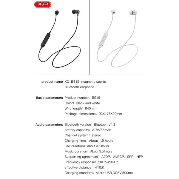اندازه کلی هندزفری گردنی XO BS15 حدود 64 سانتی متر بوده و وزنی حدود 14 گرم دارد.