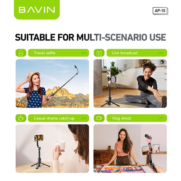 سه پایه باوین AP-18 قابلیت تنظیم ارتفاع و زاویه دارد و می‌تواند گوشی را در حالت عمودی یا افقی نگه دارد. پایه‌های مستحکم آن مانع لرزش روی سطوح مختلف می‌شوند و جنس مقاوم بدنه نیز دوام بالایی را تضمین می‌کند.