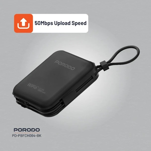 پاوربانک و مودم روتر جیبی 10000 پرودو Porodo 4G LTE | WiFi 6 Pocket Router PBFCH064 ترکیبی هوشمند از یک پاوربانک قدرتمند و مودم همراه است که تجربه‌ای متفاوت از اتصال و شارژ را برای شما به ارمغان می‌آورد. این دستگاه با ظرفیت 10000 میلی‌آمپر نه‌تنها گوشی و گجت‌های شما را در طول روز شارژ می‌کند، بلکه به‌عنوان یک مودم 4G LTE نیز امکان دسترسی پایدار و سریع به اینترنت را فراهم می‌سازد.