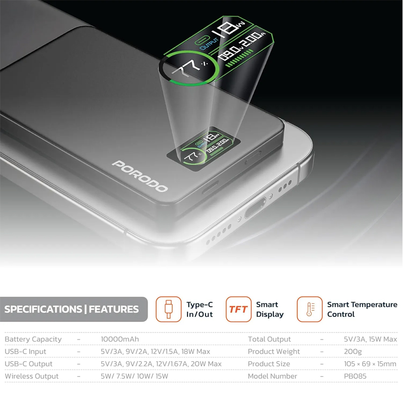 باتری قدرتمند 10000mAh این دستگاه می‌تواند چندین‌بار گوشی شما را شارژ کند و برای استفاده روزمره، سفر یا محیط کار گزینه‌ای ایده‌آل است. پرودو برای افزایش سرعت و ایمنی شارژ، از فناوری‌های **PD (Power Delivery)** و **QC3.0** بهره برده تا شارژ سریع و ایمن برای دستگاه‌های مختلف فراهم شود.