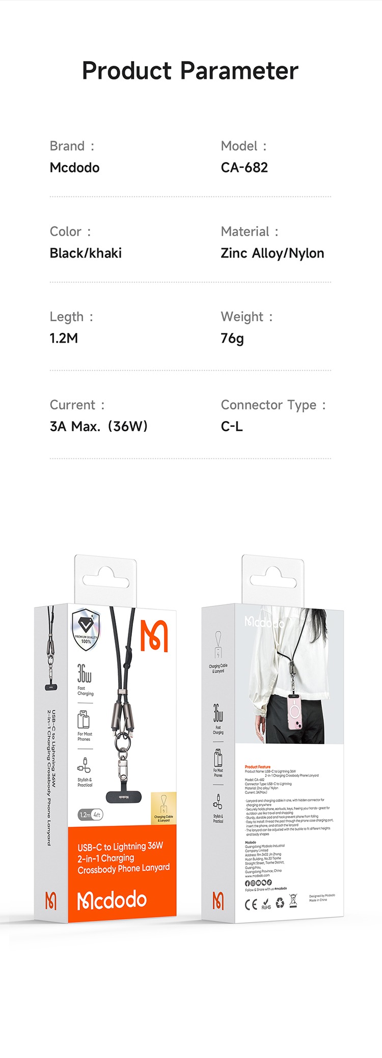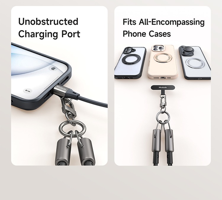 کابل Mcdodo CA-6820 یک محصول چندمنظوره از برند معتبر McDodo است که علاوه بر شارژ سریع ۳۶ وات، نقش بند آویز گردنی را نیز ایفا میکند.