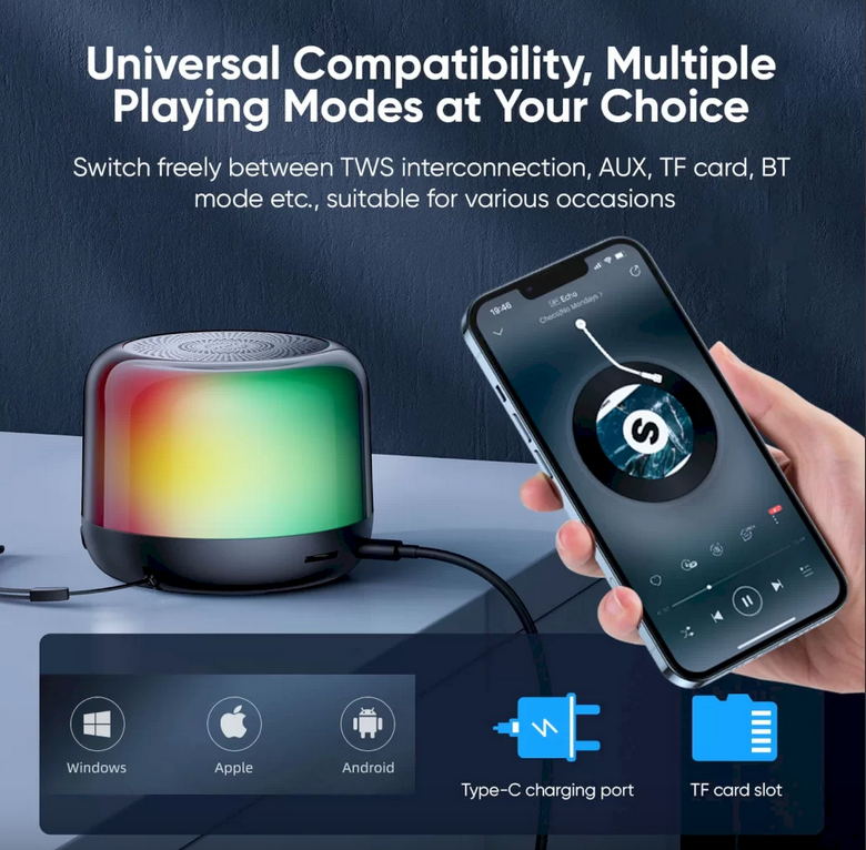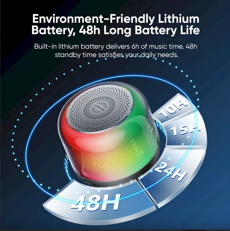 زمانی که دسترسی به پریز برق مهیا نیست و یا در سفر و گشت و گذار هستید وجود یک اسپیکر قابل حمل ضروری می شود. کمپانی جویروم که شرکتی مطرح در تولید انواع تجهیزات صوتی و لوازم دیجیتال می باشد با تولید اسپیکری قابل حمل و زیبا به نام JOYROOM Wireless speaker JR-ML03 لذت گوش کردن به موسیقی را در کنار دریا ، در جنگل و طبیعت یا حتی در منزل برایمان فراهم کرده است. از طرفی اگر در شب از این اسپیکر استفاده می کنید لذت شنیدن در کنار نور پردازی بصری و جلوه های رنگی لذت استفاده را دو چندان خواهد کرد.