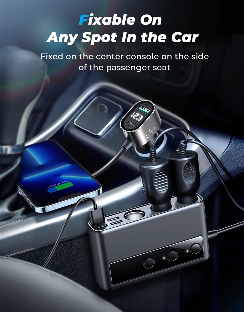 2 پورت بر روی خود شارژر فندکی برای سرنشینان جلو و 4 پورت و 3 سوکت فندکی توسط یک کابل اکستنشن به طول