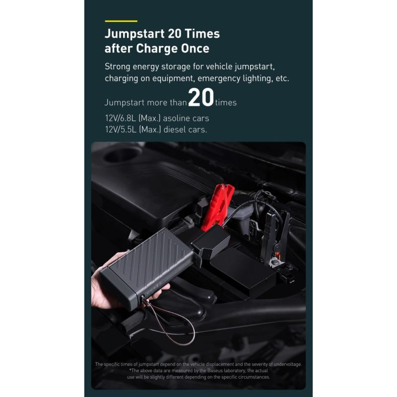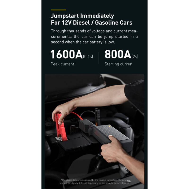 جامپ استارتر باسئوس دارای ولتاژ 12 ولت است و برای استارت در عرض 2 ثانیه توانی معادل 800 آمپر وارد میکند. بالاترین شدت جریان این جامپ استارت نیز 1600A میباشد. شیوه اتصال دستگاه بدین صورت است که باید ابتدا کابل را به جامپ استارتر متصل کرده و طرف دیگر آن که شامل دو گیره است را به سمت مثبت و منفی باتری وصل کنید. پس از مطمئن شدن از اتصال صحیح، باید استارت ماشین را بزنید و بلافاصله جامپ استارتر را جدا کنید. حالا با خیال راحت می توانید رانندگی کنید. گیرههای اتصال به باتری ماشین از جنس مس بوده و رسانایی بالایی دارند. پوشش بیرونی آنها نیز محکم بوده و در مقابل شکستن مقاوم است. این جامپ استارتر میتواند دستگاههایی که زیر 100 وات توان دارند مانند پنکه های برقی، یخچالهای کوچک و .. را نیز شارژ کند. باتری لیتیوم یونی این دستگاه با ظرفیت 16000 میلی آمپر ساعتی خود دارای دو پورت USB و تایپ سی است که توانایی شارژ دستگاه هایی مثل موبایل و تبلت را با توانی معادل 5V/4.5A و 5V/3A دارد. برای شارژ این دستگاه بهتر است از آداپتور 65 وات به بالا و یک کابل استاندارد استفاده کنید. مدت زمان لازم برای کامل شدن باتری این جامپ استارتر باسئوس 1.5 ساعت است و میتواند تا 20 مرتبه بعد از ان استفاده شود. در قسمت جانبی بدنه جامپ استارتر باسئوس CRJS02-A0G تعداد 4 درگاه وجود دارد. درگاه اول پورت خروجی DC برای اتصال دستگاههایی مانند پنکه است. درگاه دوم پورت مشترک وروردی و خروجی تایپ سی بوده و برای شارژ کردن گوشیها، مک بوک و تبل ت کاربرد دارد. شدت جریان ورودی و خروجی این پورت حداکثر 5V/3A میباشد. درگاه سوم نیز پورت خروجی USB است و قادر است با شدت جریان 4.5V/5A گوشیها و تبلتها را شارژ کنید. در کنار این درگاهها یک سری چراغ LED طراحی شده که میزان شارژ دستگاه را مشخص میکند. درگاههای آخر نیز پورتهای خروجی AC هستند که 110V-50Hz بوده و برای شارژ کردن لپ تاپها، یخچال ماشینها، لامپهای رومیزی و .. استفاده میشوند. در بسته بندی این پاوربانک علاوه بر خود محصول، یک شارژر فندکی QC با توان 63 وات، یک کابل شارژ Type C به Type C و یک کابل EC8 که یک طرف آن برای اتصال به جامپ استارتر و طرف دیگر دو گیره برای اتصال به سری های + و - باتری ماشین قرار داده شده است.