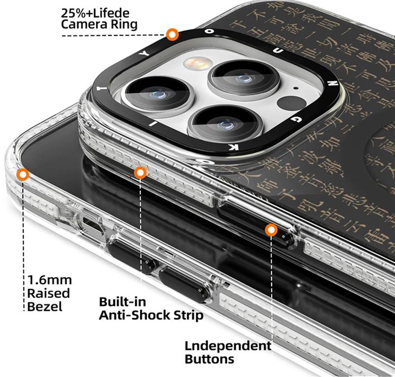 طراحی دکمه ها آنچنان دقیق است که کار با گوشی را برای کاربر آسان کرده است و به گفته اکثر استفاده کنندگان نرم ترین دکمه های موجود در بین قاب های آیفون با برند های مختلف می باشد و به لطف برش دقیق دسترسی به پورتهای گوشی برای کاربر آسان می باشد.این محصول با کیفیت بالا و با استفاده از تکنولوژی IMD ( چاپ دولایه ) نه تنها در برابر خط و خش مقوام است بلکه در مقابل سایش هم مقوام می باشد و همچنین رنگ محصول ثابت می باشد.