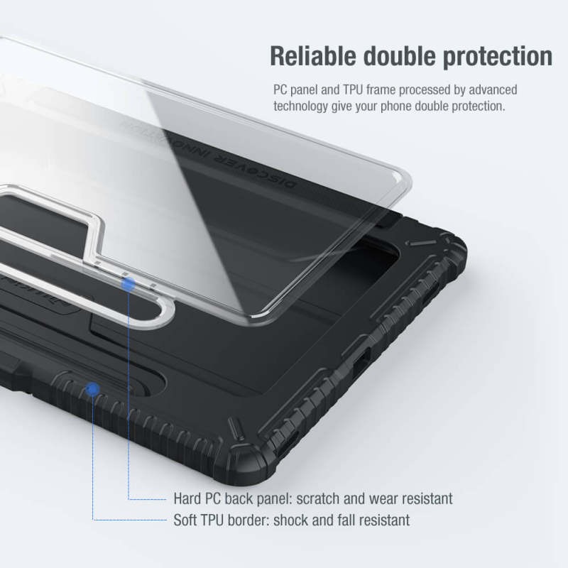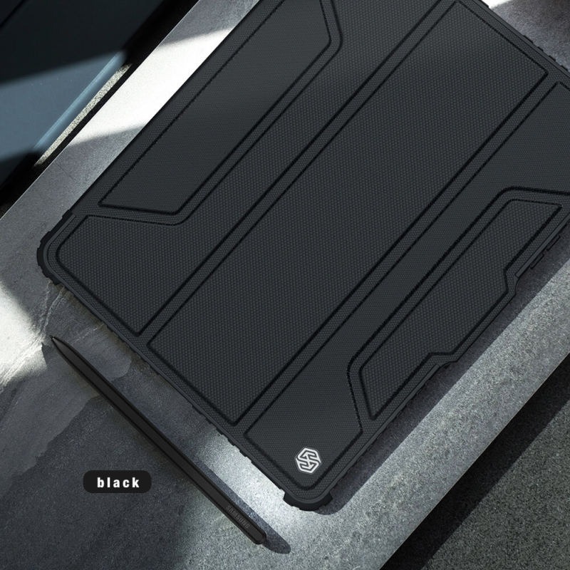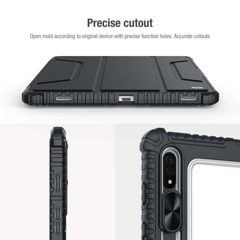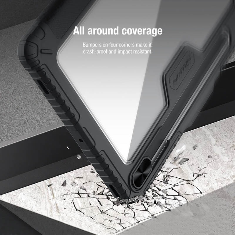 کیف کلاسوری نیلکین مدل Camshield Bumper مناسب برای تبلت سامسونگ Galaxy Tab S8 Plus/S8plus 5G/S7plus/S7fe محصولی از شرکت نیلکین است که محافظت از تبلت شما را بر عهده دارد.از ویژگی این کیف کلاسوری محافظت از لنز IPad شما میباشد که با وجود محافظ کشویی کیف در معرض خط و خش نخواهد بود. این کیف کلاسوری از tpu و پلاستیک سخت ساخته شده است و به صورت سه بعدی محافظت میکند یعنی سرتاسر تبلت را محافظت مینماید و با ظاهری ظریف زیبایی خاصی به تبلت میبخشد. این کیف کلاسوری از یک نوع پوشش ساخته شده که در برابر لغزش مقاوم است و تبلت شما را در برابر ضربه و خراش محافظت میکند.و دارای یک محافظ لنز دوربین برای جلوگیری از آسیب و خط و خش به دوربین شما نیز دارد.