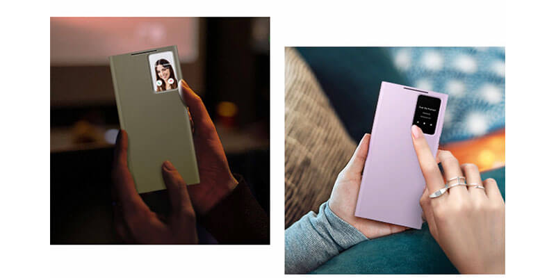 روی درب کیف هوشمند Samsung Galaxy S23 Plus Smart View Wallet Case یک پنجره کوچک قرار دارد که از طریق آن می توانید بدون باز کردن درب کیف بعضی قابلیت ها را کنترل کنید. برای مثال در زمانی که تماسی دریافت می کنید بدون باز کردن کاور کیف سامسونگ S23 Plus Smart View Wallet می توانید نام و شماره تماس گیرنده را ببینید و با سوایپ کردن روی قسمت سمت راست که مشابه یک مانیتور است، به تماس پاسخ دهید یا رد تماس کنید. همچنین امکان انتخاب تصاویر پشت زمینه را برای آن دارید. با فعال بودن صفحه نمایش همیشه روشن (Always On Display)، این قابلیت در پنجره کوچک نیز به نمایش در خواهد آمد.