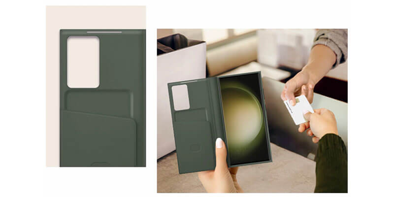 روی درب کیف هوشمند Samsung Galaxy S23 Plus Smart View Wallet Case یک جاکارتی تعبیه شده است و می توانید کارت شناسایی یا کارت بانکی خود را در آن قرار دهید.