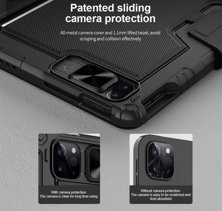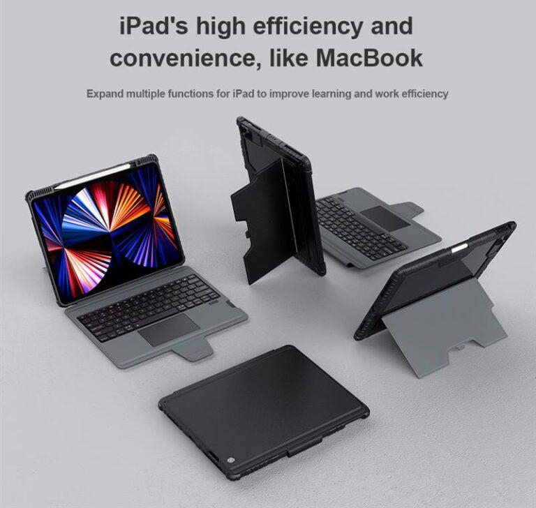 کیف کلاسوری نیلکین مدل New Bumper Combo Keyboard یکی از مهم ترین و کاربردی ترین لوازم جانبی است که شما در کنار iPad خود باید تهیه کنید تا تجربه کاربری خود را با دستگاهتان به حداکثر برسانید. ابتدایی ترین کاری که New Bumper Combo Keyboard برای شما انجام خواهد داد محافظت کامل از تمام قسمت های iPad به خصوص دوربین شماست. پوشش خارجی که ترکیبی با کیفیت از پلی کربنات PC و TPU است و نسبت به نسخه قبلی خود ارتقا یافته است iPad شما را در برابر هرگونه ضربات احتمالی و خط و خش ناشی از برخورد با اشیا تیز حفظ میکند. داشتن چنین کیف محافظی در وهله اول با توجه به ارزش بالای دستگاه شما یک امر غیر قابل چشم پوشی است. قابلیت دیگر قابل ملاحظه این است که این قاب برای شما در زاویه 110 تا 180 درجه به صورت استند در میآید تا بتوایند به سادگی هرچه تمام تر به مشاهده فیلم و سریال و یا انجام طراحی و مطالعه کتاب یا مقالات الکترونیکی خود بپردازید بدون آنکه نگران سر خوردن دستگاه باشید. در چهار گوشه این قاب برآمدگی هایی ایجاد شده است تا در صورت سقوط دستگاه ورود ضربه به دستگاه را به حداقل برساند. یکی از مهم ترین ویژگی های این کیف کلاسوری داشتن یک کیبورد بی سیم با بورد 10 متری است که طراحی آن نسبت به نسخه قبلی خود بهینه تر شده است و دکمه های کیبورد طوری طراحی شده اند که بسیار نرم و بدون ایجاد لغزندگی در هنگام تایپ هستند و کمترین صدای ممکن را در هنگم تایپ ایجاد میکنند. دکمه های میانبر آن نیز نسبت به مدل قبلی بهینه تر شده و دارای تغییراتی شده اند. یک باتری 180 میلی آمپر ساعتی لیتیومی در آن بکار رفته است که تنها با 2.5 ساعت شارژ طی تست ها با حدود روزی 2 ساعت کارکرد تا 55 روز برای کاربر کارایی خواهد داشت، پس نگران اتمام شارژ آن در هنگام سفر و یا محیط های بیرون نخواهید بود. تاچ پد روی کیبورد نیز با قابلیت های مختلفی طراحی شده است و همچنین گزینه ای طراحی شده تا بتوانید آنره قفل کنید تا اگر به صورت تصادفی انرا لمس کردید به مشکلی نخورید. نسخه بلوتوث این کیبورد 3.0 است پس حساسیت عملکرد بالایی از آن خواهید دید و به صورت کلی به همراه این کیف کلاسوری فوق العاده از iPad خود میتوانید به مانند یک مک بوک کامل استفاده نمایید. در قسمت جلویی قاب نیز محلی برای قرار دادن قلم هوشمند اپل و شارژ آن به صورت وایرلس طراحی شده است.