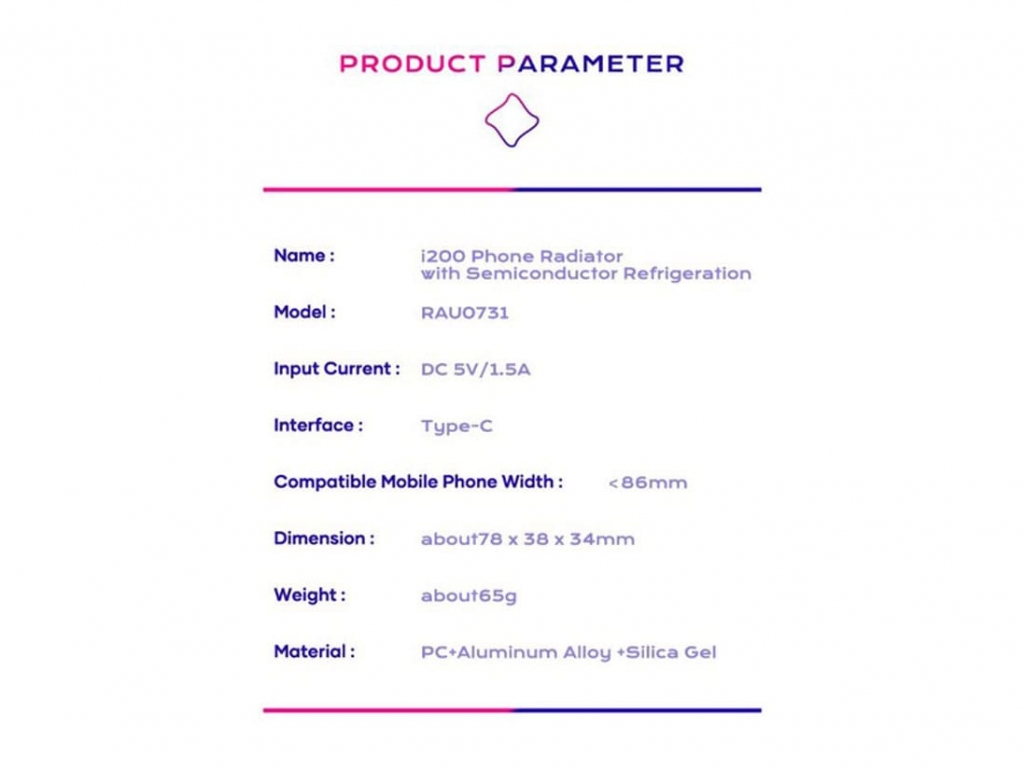 خنککننده موبایل راک Rock Space i100 Mobile Cooling Radiator with Semiconductor RAU0731 دارای طراحی بسیار جالبی است و با نصب پشت گوشی هنگام استفاده از آن، به راحتی قابل استفاده است و هیچگونه مزاحمتی برای دستانتان ایجاد نمیکند و بعد از مدت بسیار کوتاه 2 ثانیه شروع به کار میکند. سازگار با گوشیهایی با عرض 86 میلیمتر است.