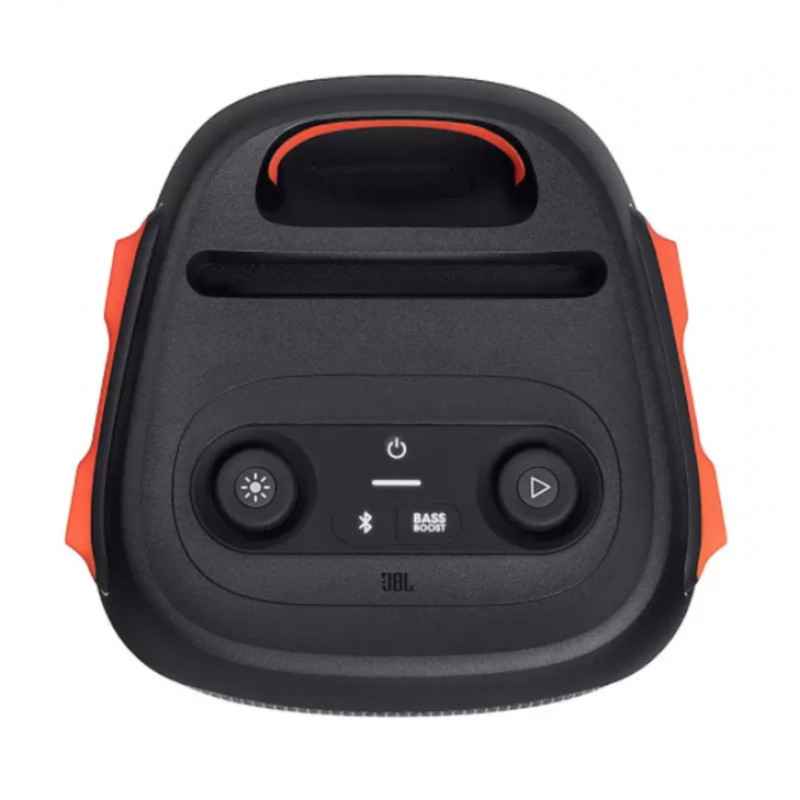 ویژگی که باعث میشود بتوانید با خیال راحت اسپیکر partybox 110 را به محیط خارج از خانه و یا حتی کنار استخر منتقل کنید، گواهی IPX4 در نظر گرفته شده برای آن است که سبب میشود دستگاه در برابر پاشش آب مقاوم باشد. به خاطر داشته باشید که این گواهی به معنای ضد آب بودن اسپیکر نیست و اگر آن را به طور کامل درون آب قرار دهید محصول با مشکل مواجه خواهد شد. به روی سر اسپیکر دو دکمه برای تنظیم نور و همچنین پخش/توقف موسیقی دیده میشود و از طریق همین پنل میتوانید به بلوتوث نیز دسترسی داشته باشید و اسپیکر را خاموش/روشن کنید. دکمه Bass Boost موجود به روی همین پنل باعث افزایش بیس اسپیکر میشود و در نهایت جایگاه موجود در این قسمت به شما امکان میدهد تا گوشی خود را برای داشتن کنترل بهتر مانند استند به روی اسپیکر قرار دهید.