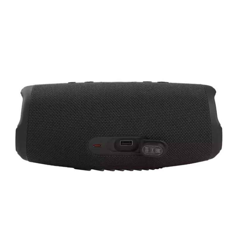 بخش بالایی اسپیکر JBL Charge 5 میزبان دکمه‌های ولوم، پخش/توقف موزیک، پاور، بلوتوث و دکمه اتصال به دیگر اسپیکرها است. به کمک این دکمه‌ها می‌توانید کنترل کاملی به روی محصول داشته باشید. در نهایت قسمت پشتی اسپیکر درگاه Type-C برای شارژ محصول و درگاه USB-A (زیر درپوش برای جلوگیری از نفوذ آب) را شامل می‌شود. کاربرد درگاه USB-A برای اتصال فلش مموری نیست و به کمک این درگاه می‌توانید گوشی خود را شارژ کنید و اسپیکر نقش یک پاوربانک را ایفا می‌کند.