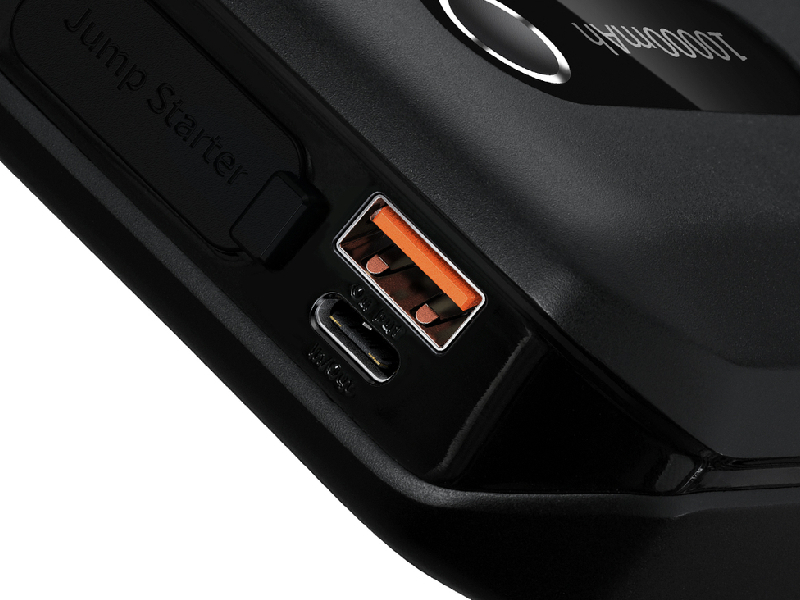پورتهای خروجی و ورودی: در قسمت جانبی بدنه جامپ استارتر 3 عدد درگاه خروجی وجود دارد؛ یک عدد پورت خروجی USB معمولی جهت شارژ سریع گوشی و تبلت با شدت جریان خروجی 5V/2.4A و یک عدد پورت تایپ سی دو طرفه برای شارژ کردن سریع گوشی، تبلت، مک بوک و خود پاوربانک با شدت جریان ورودی و خروجی 5V/2.4A و درگاههای آخر نیز برای اتصال کلمپها با باتری ماشین استفاده میشود.