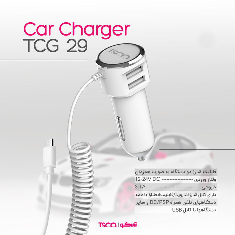 شارژر فندکی « تسکو » با درگاههای فندکی خودروهای مختلف سازگاری دارد. روی سطح این شارژر دو درگاه خروجی USB طراحی شده که برای شارژ کردن باتری دو دستگاه مختلف مانند گوشی موبایل، دوربین دیجیتال، تبلت و دیگر لوازم از این قبیل به طور همزمان مناسب خواهد بود. شدت جریان خروجی در یکی از درگاههای این محصول 1.0 آمپر و جریان خروجی درگاه دوم این شارژر 2.1 آمپر است. بنابراین مدل « TCG 29 » از سری محصولات تسکو علاوه بر گوشیهای موبایل، دوربین دیجیتال و موزیکپلیر برای شارژ باتری انواع تبلت و آیپدها هم مناسب خواهد بود. ولتاژ ورودی در این محصول 12 تا 24 ولت بوده و ولتاژ خروجی در آن 5 ولت است. این شارژر 48 گرم وزن دارد و ابعاد آن 30 × 30 × 80 میلیمتر هستند. برای استفاده از این شارژر کافی است آن را به طور مستقیم به درگاه فندک داخل خودرو متصل کنید. شارژر فندکی تسکو مدل TCG 29، باتری دو دستگاه مختلف را بهطور همزمان، بدون نیاز به پریز برق شارژ کنید.